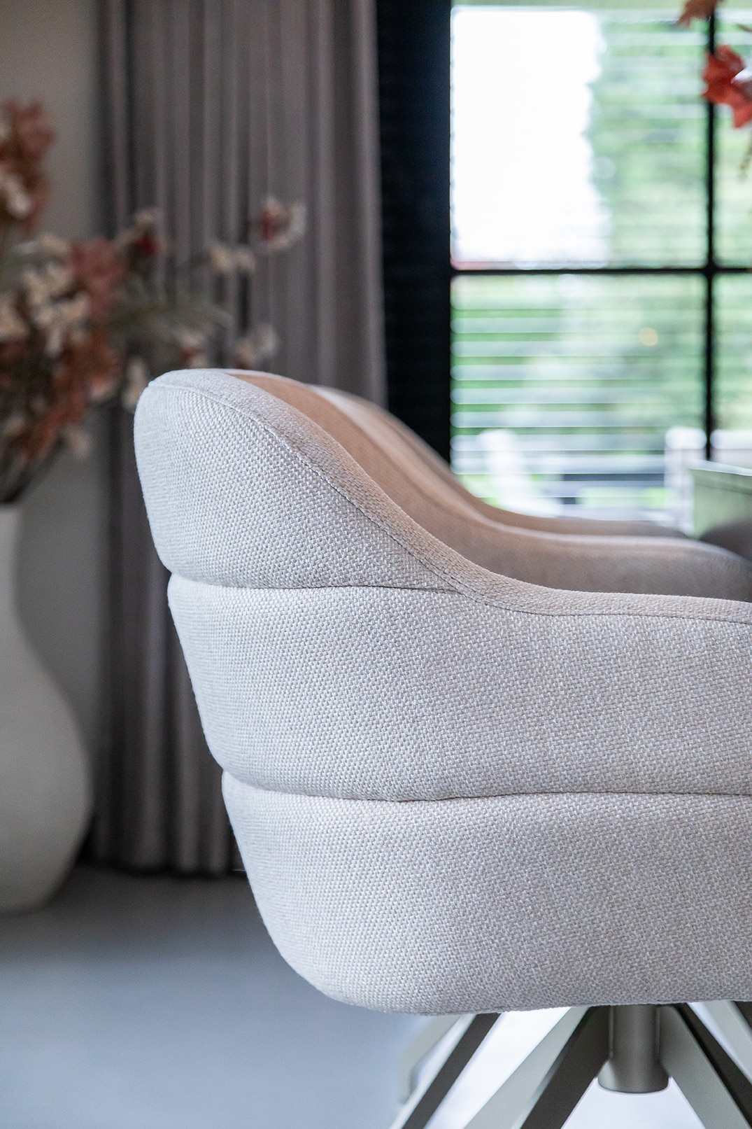 Eetkamerstoel Bowie @house.nthings is leverbaar in meer dan 700 verschillende stoffen en kleuren. In onze showrooms kun je alle stof- en lederstalen bekijken en vergelijken.