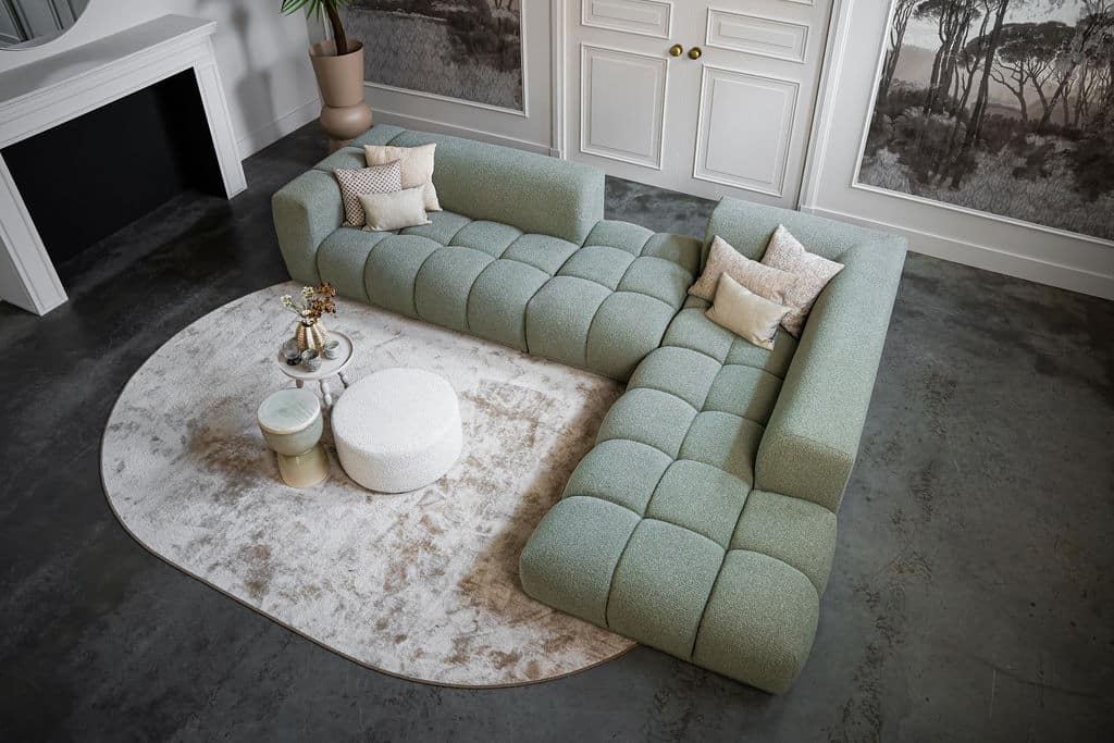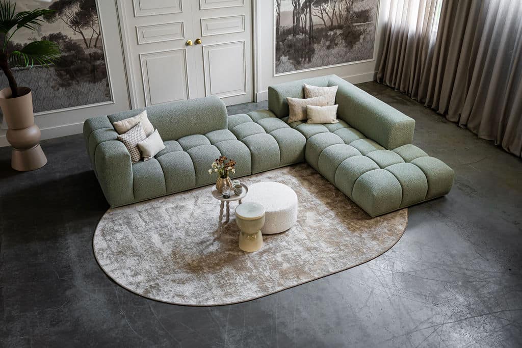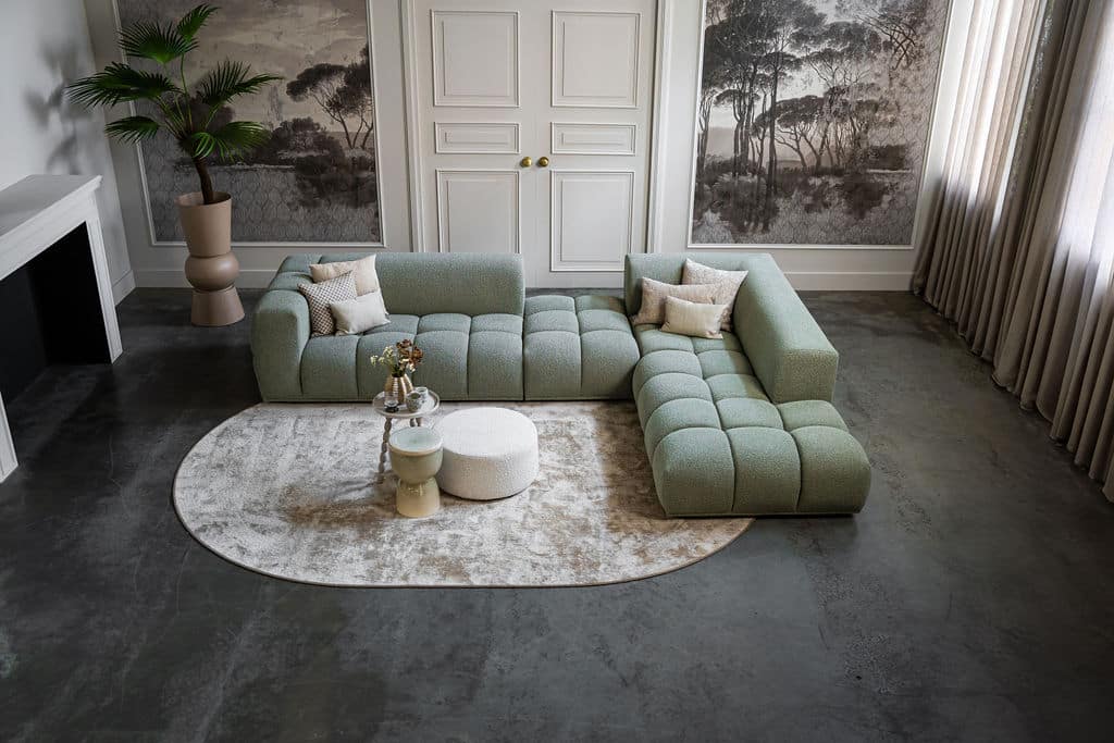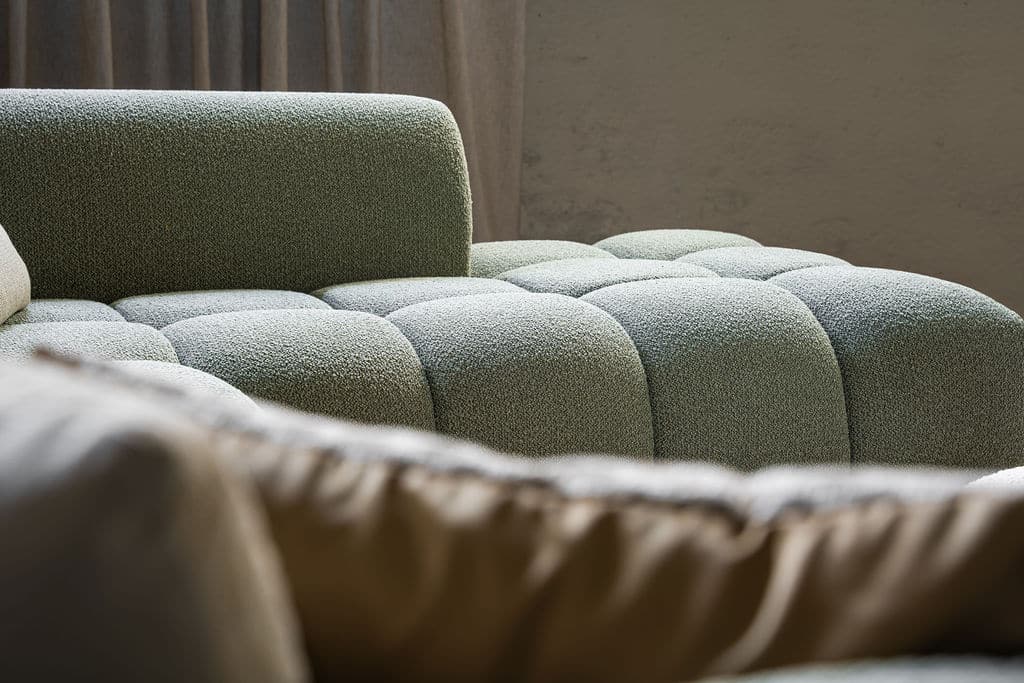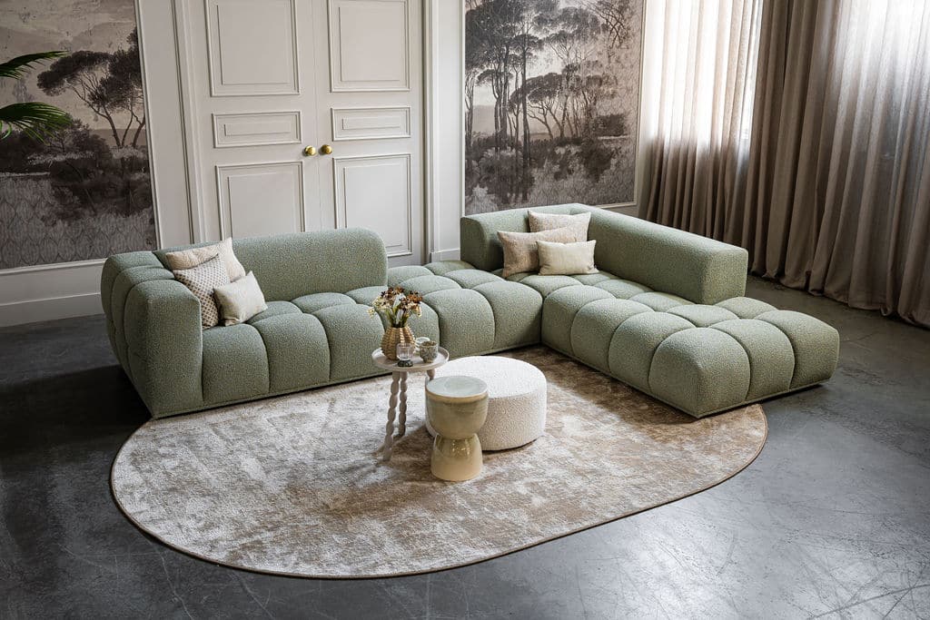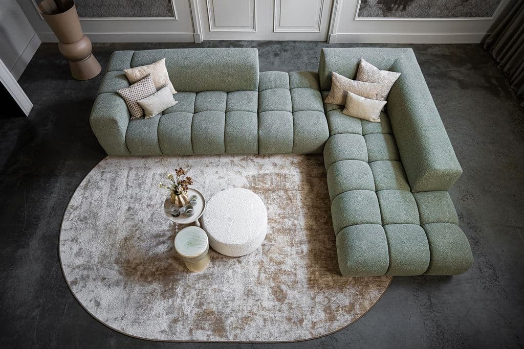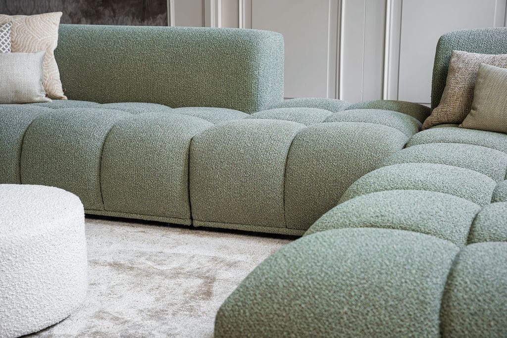 Corner sofa Oriane is a unique and trendy sofa that will be the centerpiece of your interior! The "blocks" are what makes the Oriane special. By combining the different elements, you create the ideal (corner) sofa! In addition to its cool appearance, the Oriane corner sofa has a wonderful seating comfort. The sofa here is made of a luxurious, sturdy fabric with a hint of green, but of course you can choose from all fabrics and colors from our extensive fabric collection.
