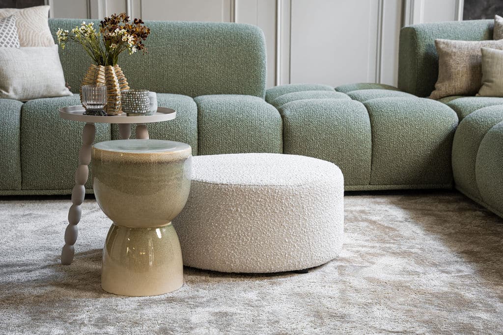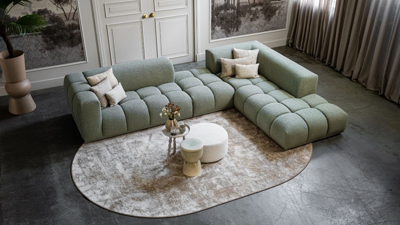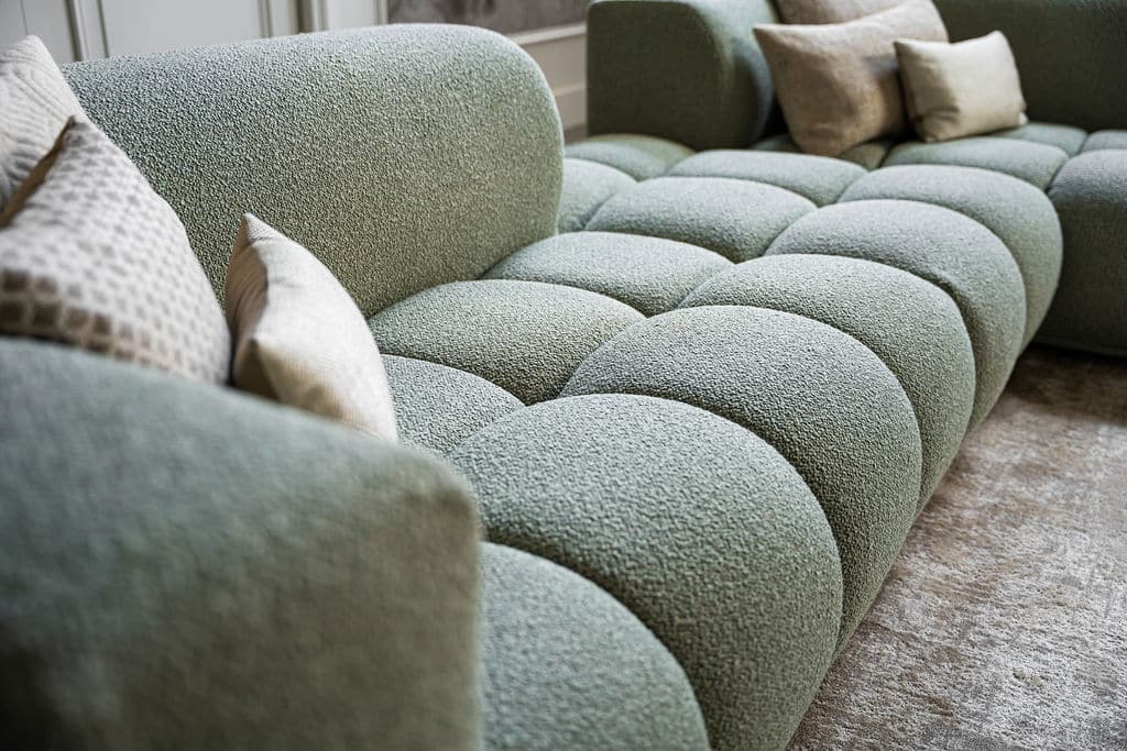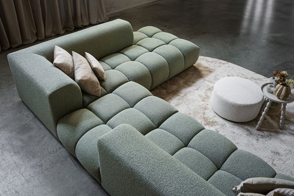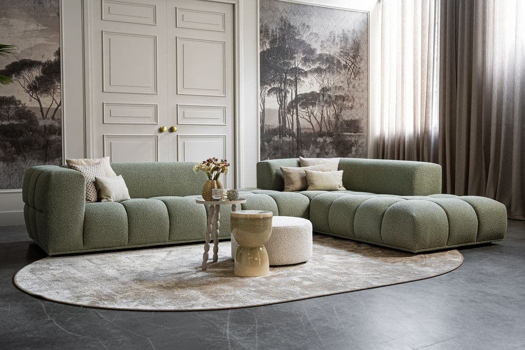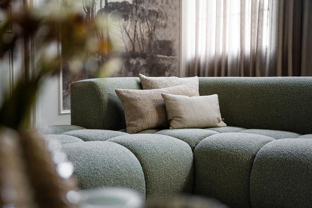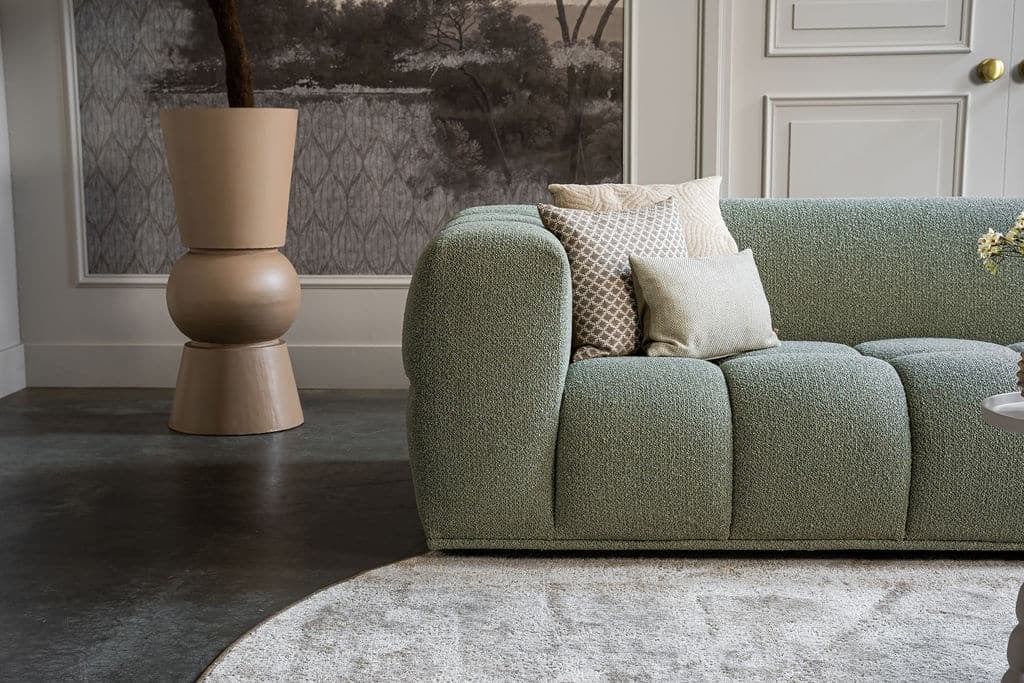 Corner sofa Oriane is a unique and trendy sofa that will be the centerpiece of your interior! The "blocks" are what makes the Oriane special. By combining the different elements, you create the ideal (corner) sofa! In addition to its cool appearance, the Oriane corner sofa has a wonderful seating comfort. The sofa here is made of a luxurious, sturdy fabric with a hint of green, but of course you can choose from all fabrics and colors from our extensive fabric collection.
