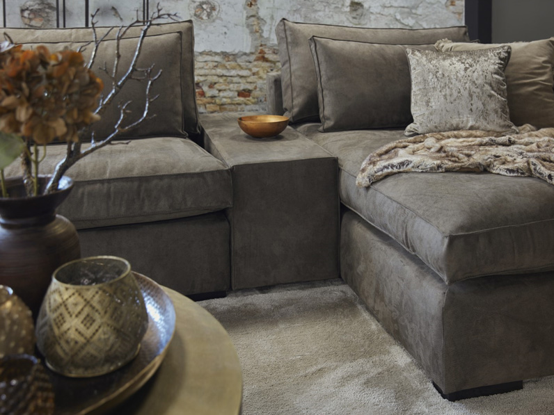 Le canapé d'angle Annabelle – In between comporte un élément ouvert (un intermédiaire) entre les sièges et la chaise longue. Cet élément offre un agencement particulier, mais est également très utile pour placer une collation ou une boisson lors d'une agréable soirée sur le canapé Annabelle !