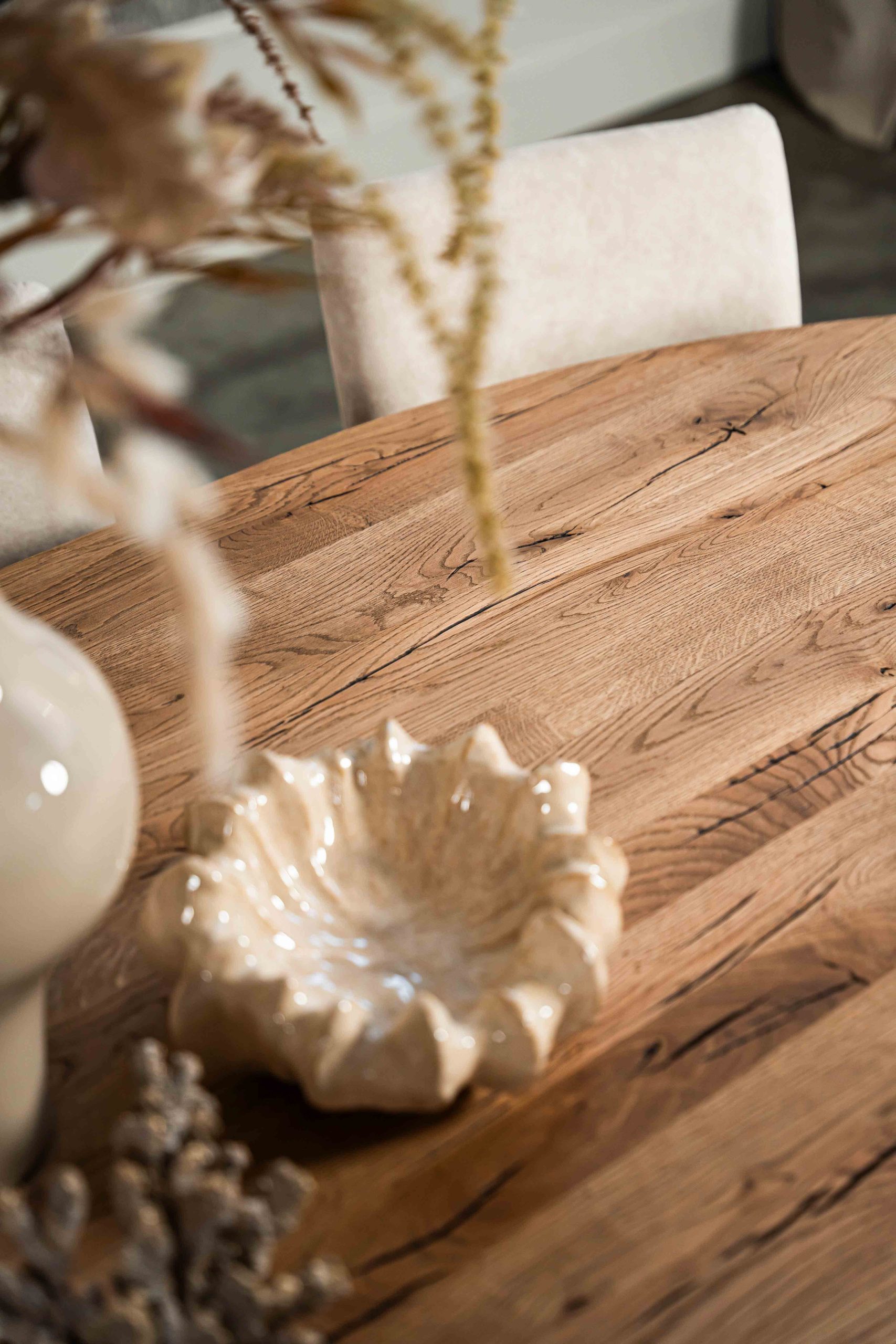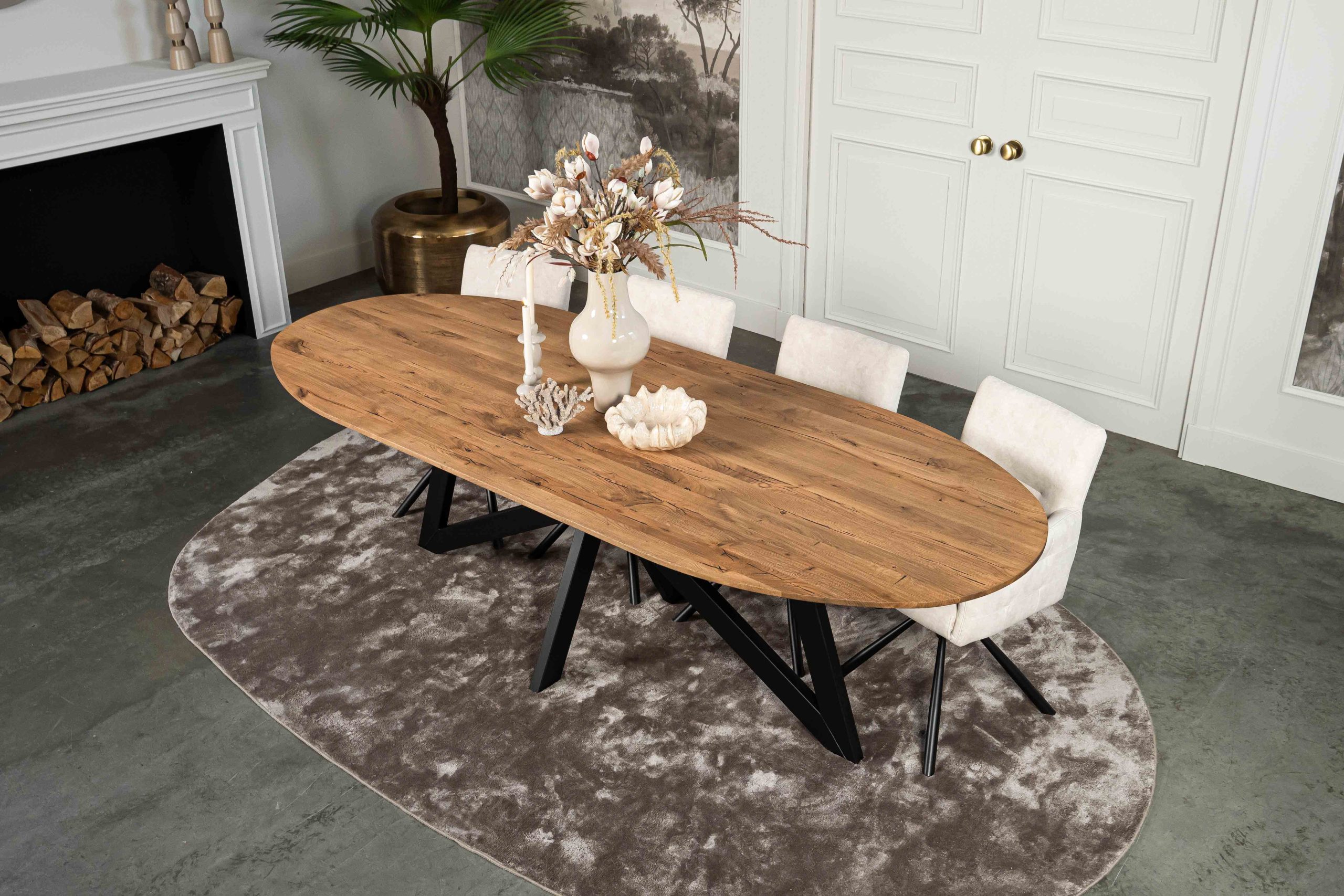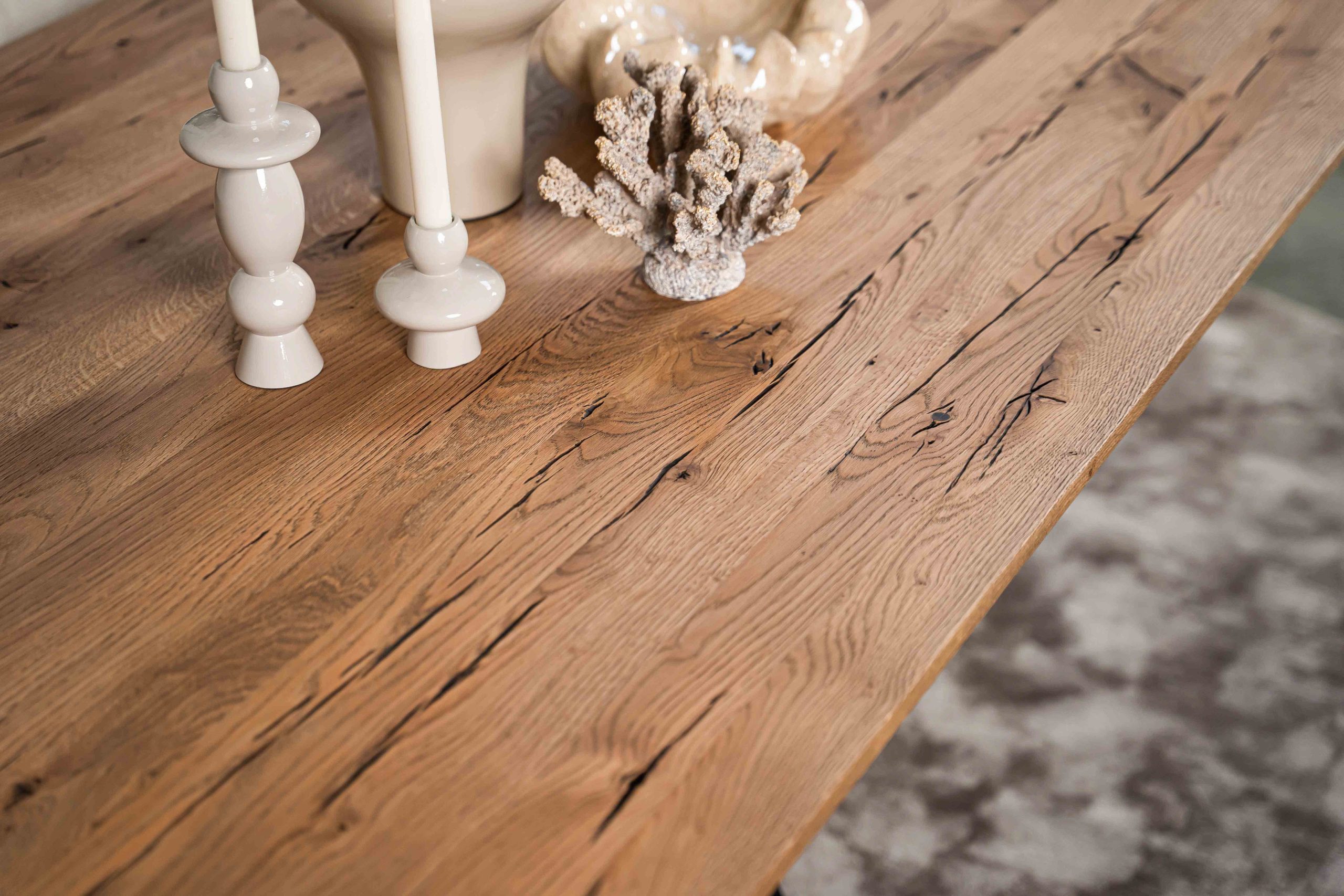 *Dit is een rustieke eiken tafel die kenmerken bevat die door de natuur gevormd zijn. De hoeveelheid scheuren, noesten en kleurnuances kunnen van tafel tot tafel verschillen. De onbewerkte tafels zijn NIET behandeld, dit is een naturel eiken. Je kunt ervoor kiezen om je tafel puur natuur te houden of te behandelen met een olie of lak. De door ons gekleurde tafels zijn gelakt en daardoor optimaal beschermd tegen vocht en vuil van buitenaf.